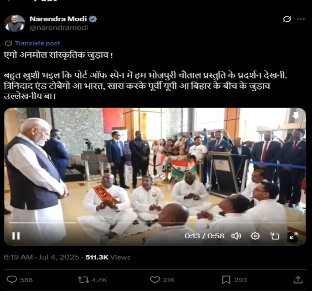 जब पीएम मोदी एयरपोर्ट पहुंचे, तो वहां भोजपुरी संस्कृति की झलक देखने को मिली। पारंपरिक परिधानों में सजे कलाकारों ने ढोलक, मंजीरा और चौताल गायन के ज़रिए भारतीयता का जश्न मनाया। इस भावुक पल का वीडियो पीएम मोदी ने अपने X (पूर्व में ट्विटर) अकाउंट पर भी शेयर किया और लिखा –